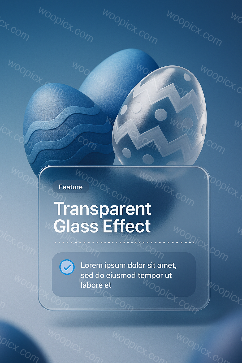 This image features beautifully designed Easter eggs with a transparent glass effect. The eggs showcase various blue patterns, set against a smooth gradient background, creating a modern aesthetic.