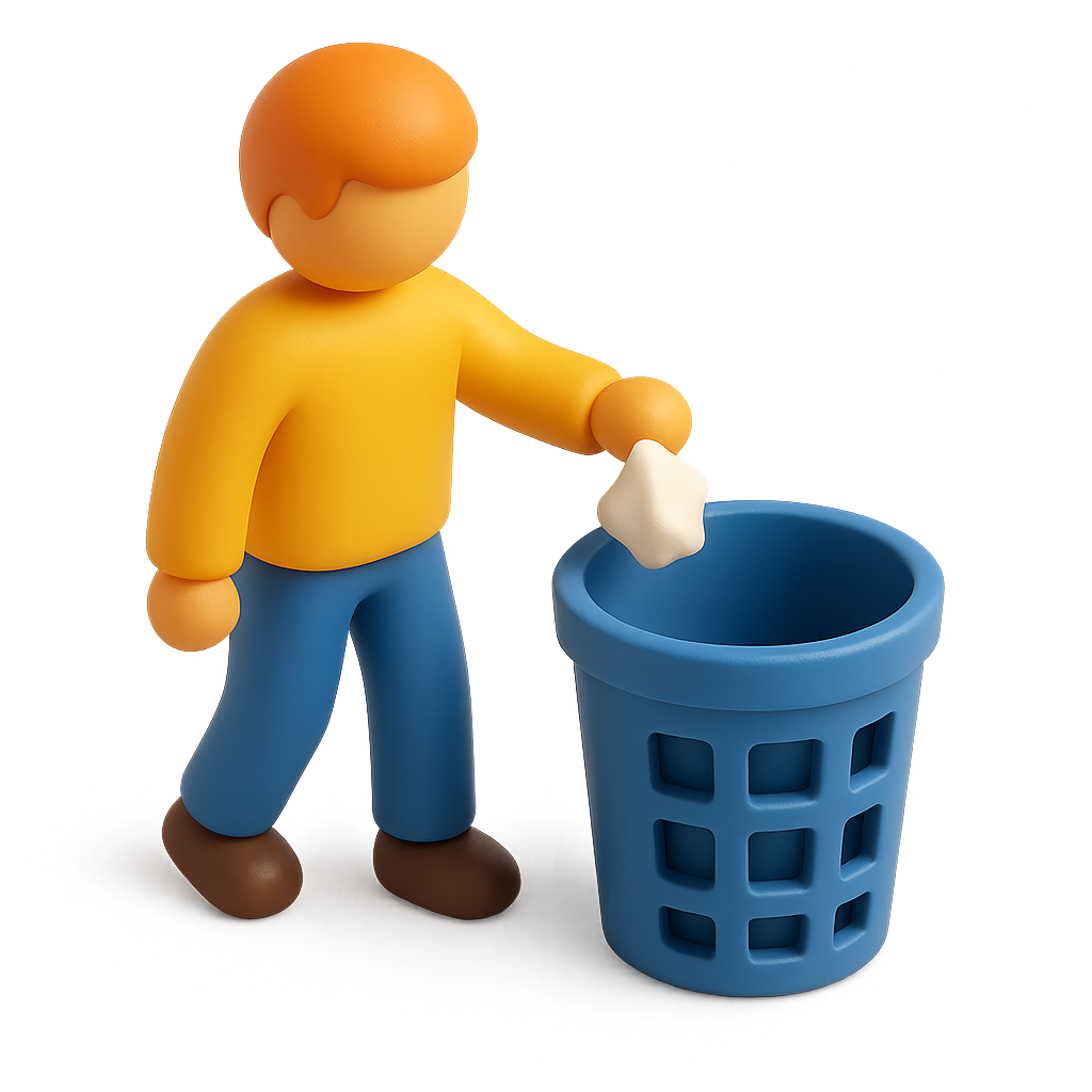 A 3D illustration of a person in a yellow shirt throwing trash into a blue bin. The icon features a stylized character and a transparent background, emphasizing a modern, isometric design.