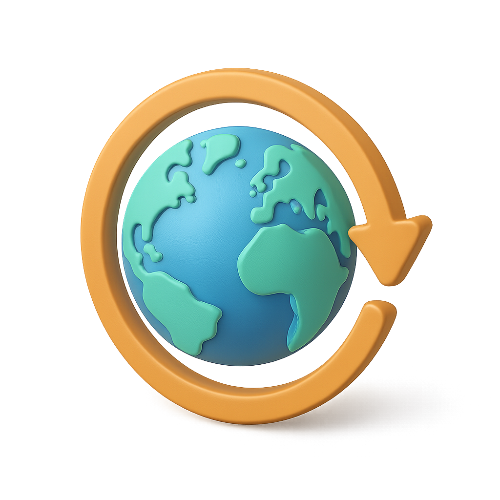 A vibrant 3D globe icon featuring a circular arrow, showcasing a three-quarter view with a smooth, volumetric design. The globe displays detailed continents in shades of blue and green against a warm background.