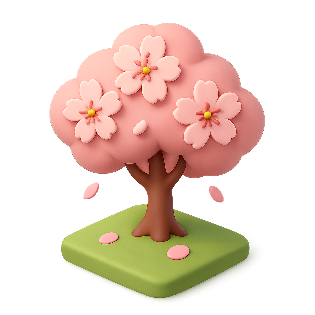 A charming 3D icon of a cherry blossom tree featuring pink flowers and a brown trunk, set on a green base with petals scattered around. Ideal for spring-themed designs.
