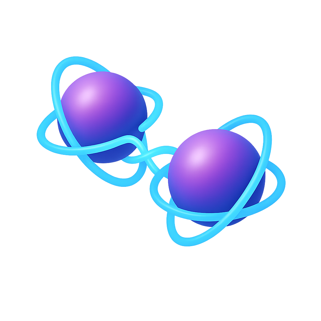 A vibrant 3D icon representing quantum entanglement, featuring two purple spheres connected by a glowing blue loop. The isometric design enhances the visual depth.