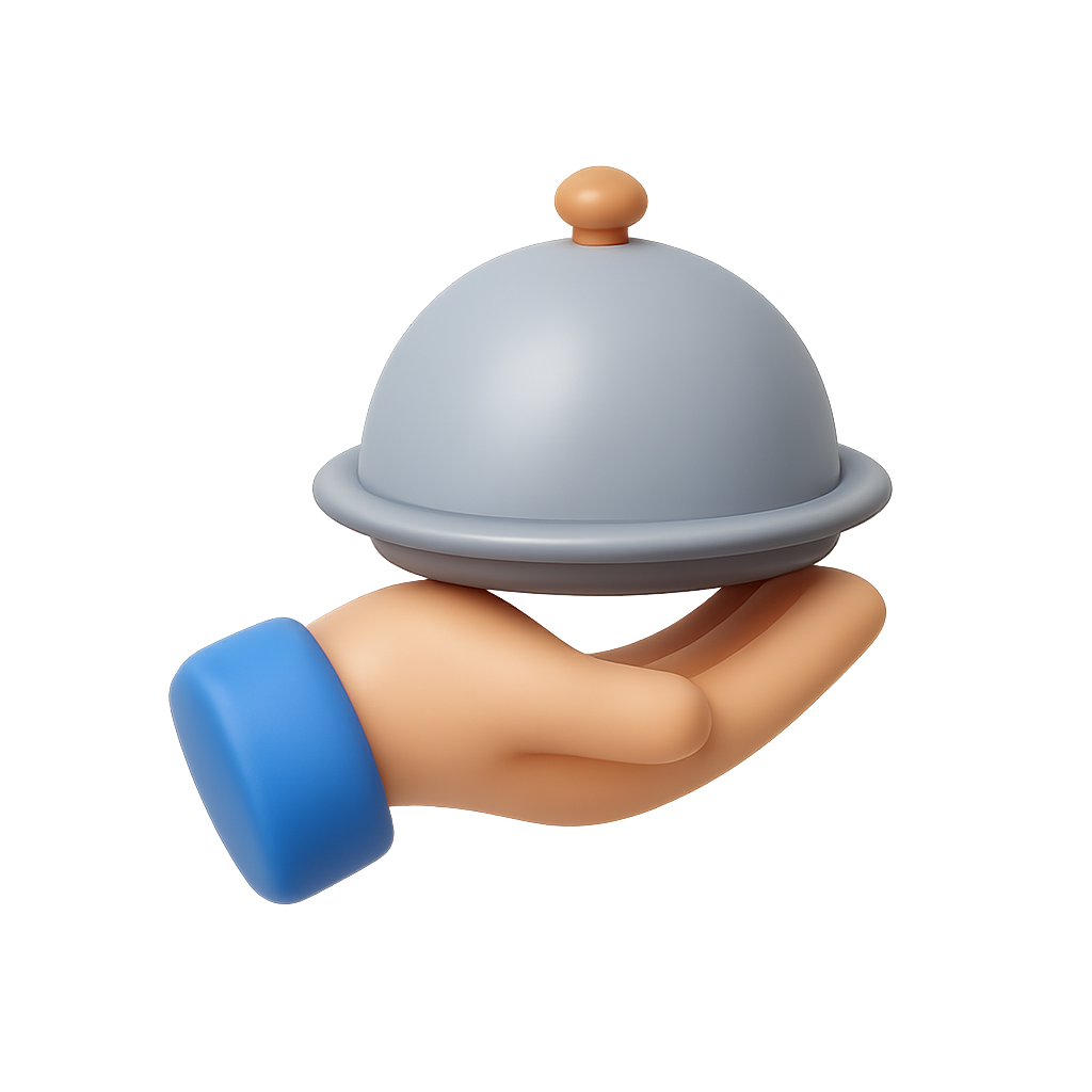 A stylized 3D icon depicting a hand holding a covered dish, featuring a gray dome and a small knob on top. The design is isometric with a volumetric feel, set against a transparent background.