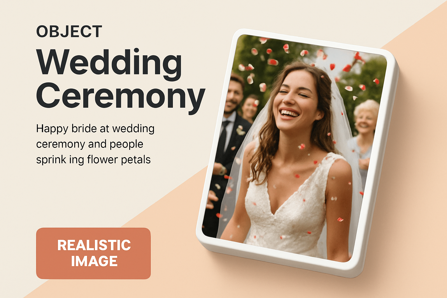 A joyful bride smiles during her wedding ceremony as guests sprinkle flower petals. The background features soft pastel colors that enhance the celebratory atmosphere.