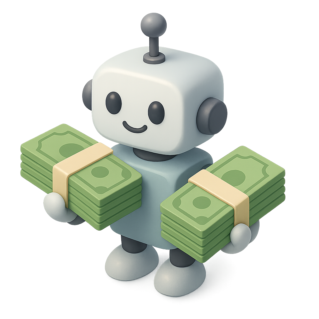 A charming 3D robot character holds stacks of cash, depicted in a three-quarter isometric view. The design features a friendly expression and a clean, minimalistic style.