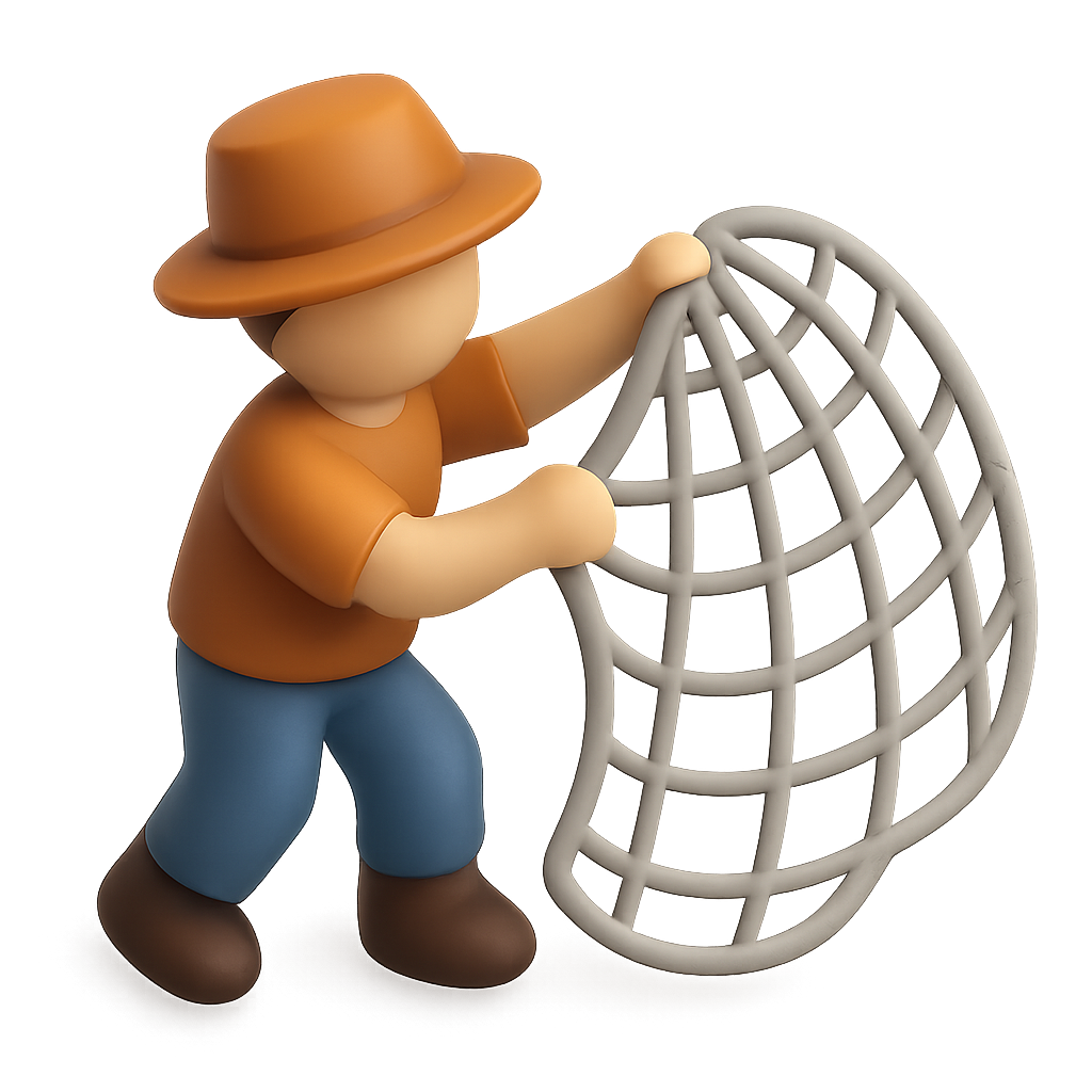 A stylized 3D icon of a fisherman casting a net, featuring a character in an orange shirt and brown hat, designed in an isometric perspective with a transparent background.