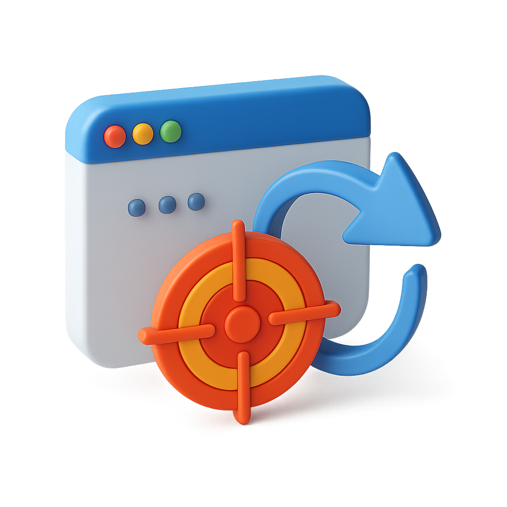 /Collection: /by davooda/Type: PNG/A vibrant 3D icon illustrating retargeting pixel tracking. It features a browser window with colorful buttons and a circular arrow, alongside a target symbol, all rendered in a three-quarter view with a transparent background.