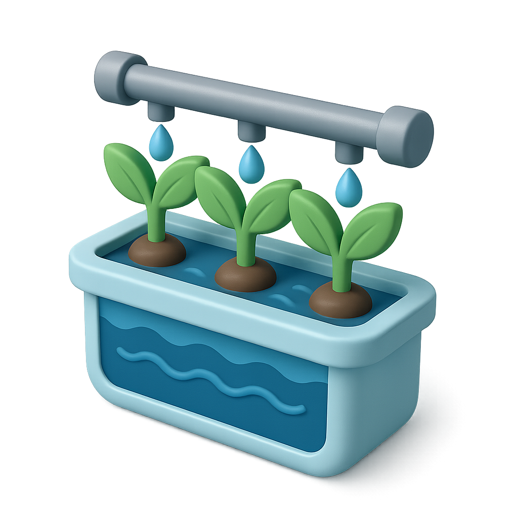 3D Hydroponic System Icon with Plants and Water Droplets