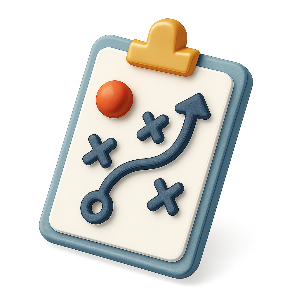 A colorful 3D icon depicting a strategy plan with arrows, dots, and crosses. The design features a clipboard-style shape, showcasing a three-quarter view with a transparent background.