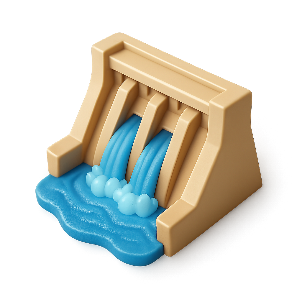 A stylized 3D icon of a hydroelectric dam featuring flowing blue water. The design showcases an isometric view with a smooth, volumetric feel and a transparent background.