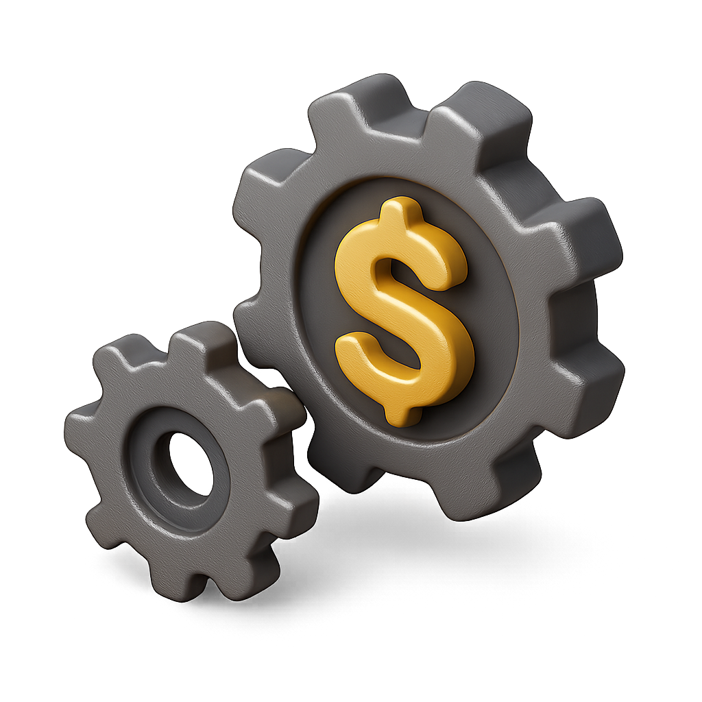 A 3D representation of two interlocking gears, one prominently featuring a dollar sign in yellow. The design emphasizes a modern, isometric view with a glossy finish.