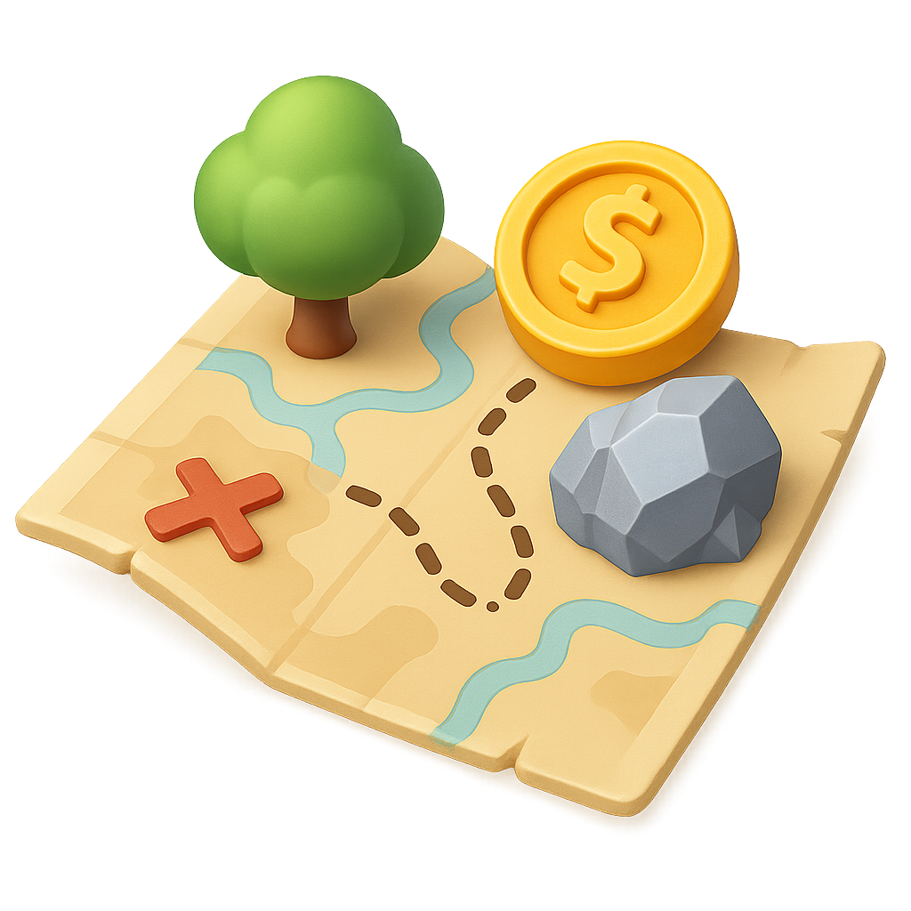 A vibrant 3D icon depicting a map featuring a tree, a dollar coin, a rock, and a dotted path. The design is in a three-quarter view with a transparent background.