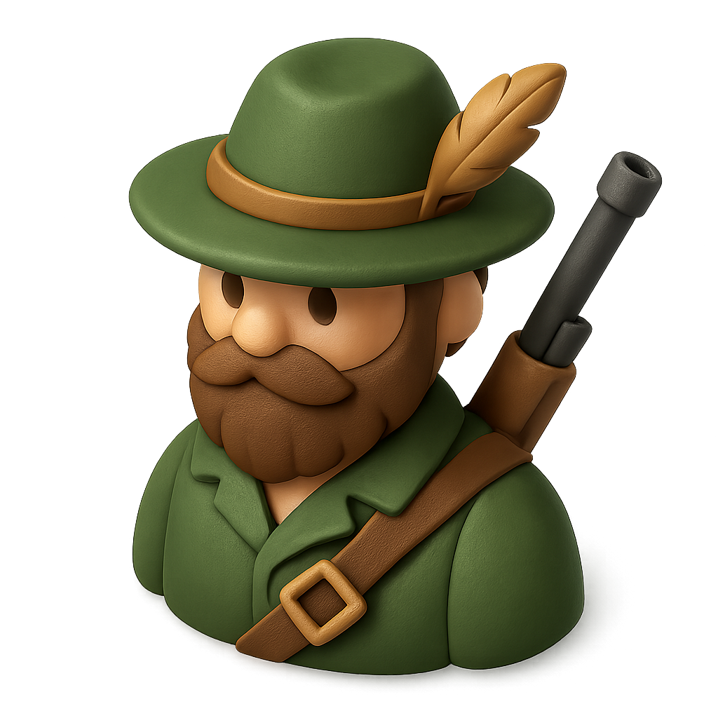 This 3D icon depicts a German hunter with a green outfit, a hat adorned with a feather, and a rifle slung over his shoulder, presented in a three-quarter view.