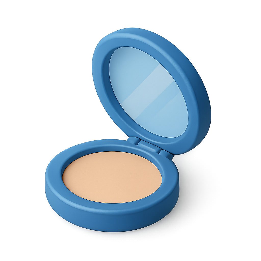 /Collection: /by davooda/Type: PNG/This image features a 3D-rendered powder compact icon, showcasing a blue case with a smooth finish. The compact is open, revealing a light beige powder inside, set against a subtle gradient background.