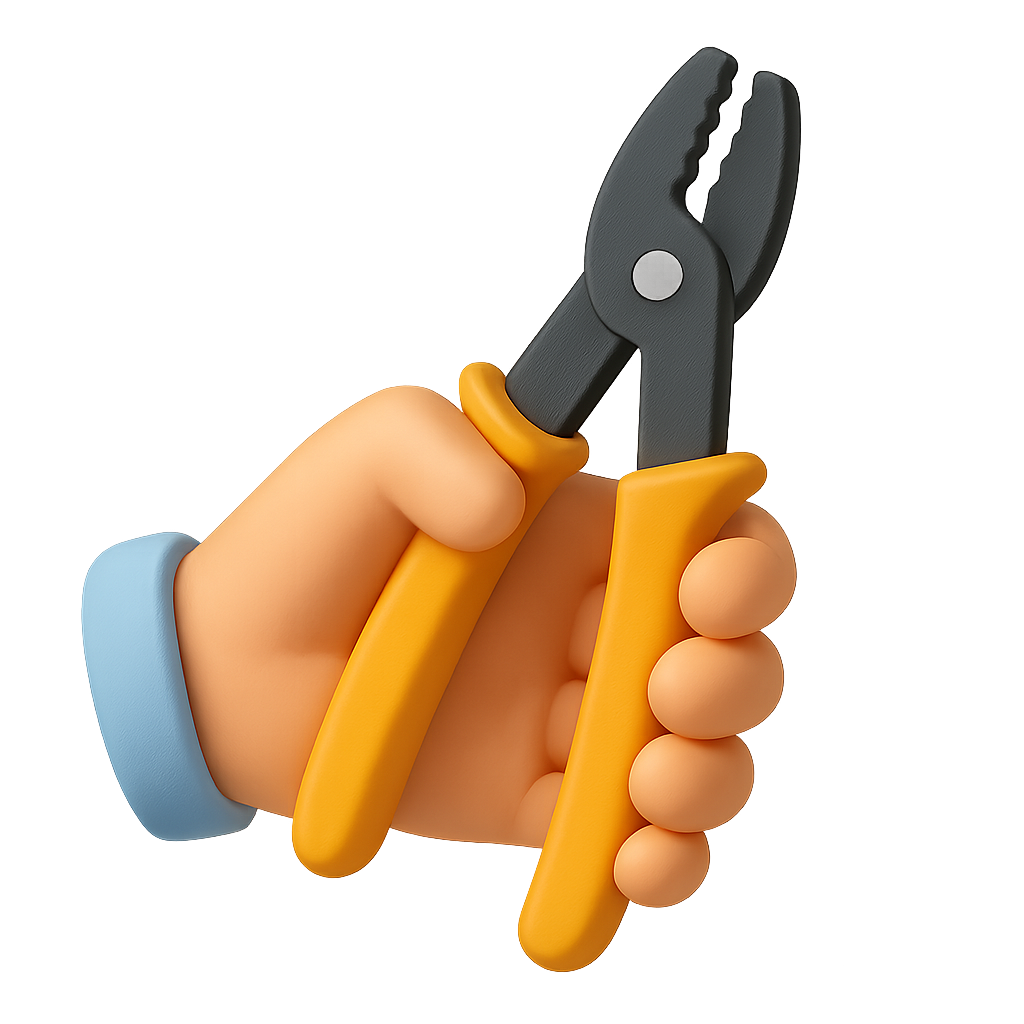 A vibrant 3D icon of a hand gripping a wire stripper, featuring a transparent background and a three-quarter isometric view, emphasizing a volumetric design.