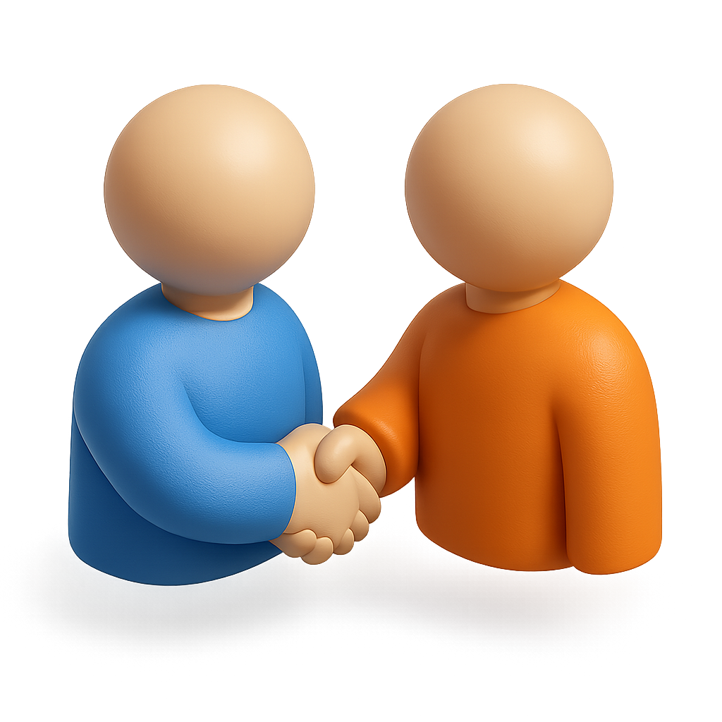A visually appealing 3D icon depicting two stylized figures shaking hands. The figures are rendered in a three-quarter view with a smooth, volumetric design, showcasing a blue and an orange color scheme.