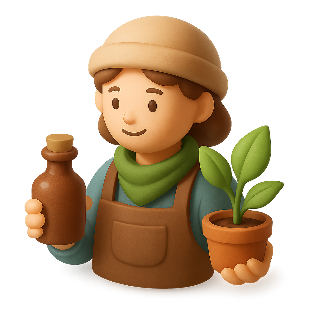 A charming 3D icon of a herbalist holding a potion bottle in one hand and a potted plant in the other. The character wears a hat and scarf, set against a soft gradient background.