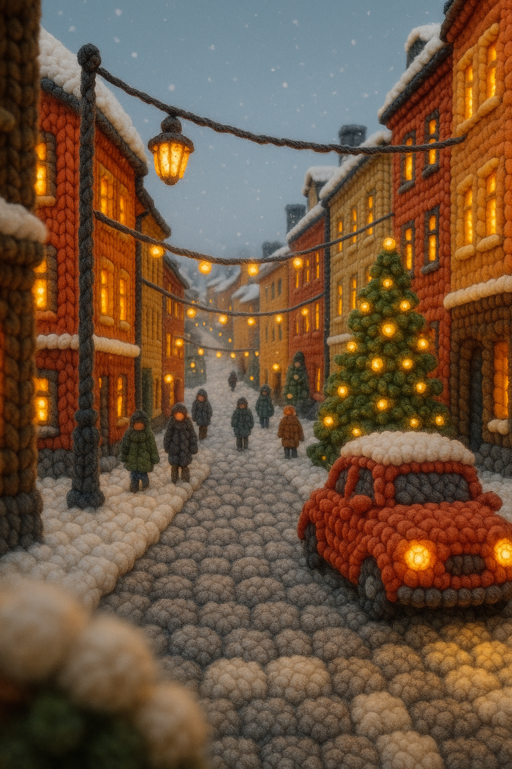 Cozy Knitted City Scene in Snow