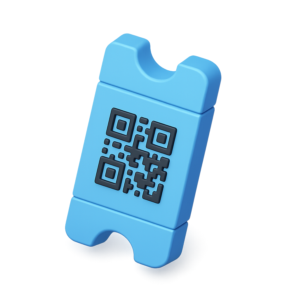 A vibrant blue ticket icon featuring a prominent QR code, designed in a 3D isometric style. The ticket has a transparent background, giving it a modern and sleek look.