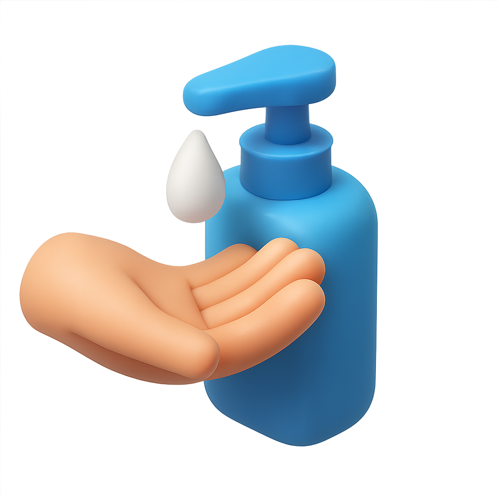 A stylized 3D icon featuring a hand reaching out to a blue soap dispenser, with a soap droplet above the hand, designed in a volumetric isometric style.