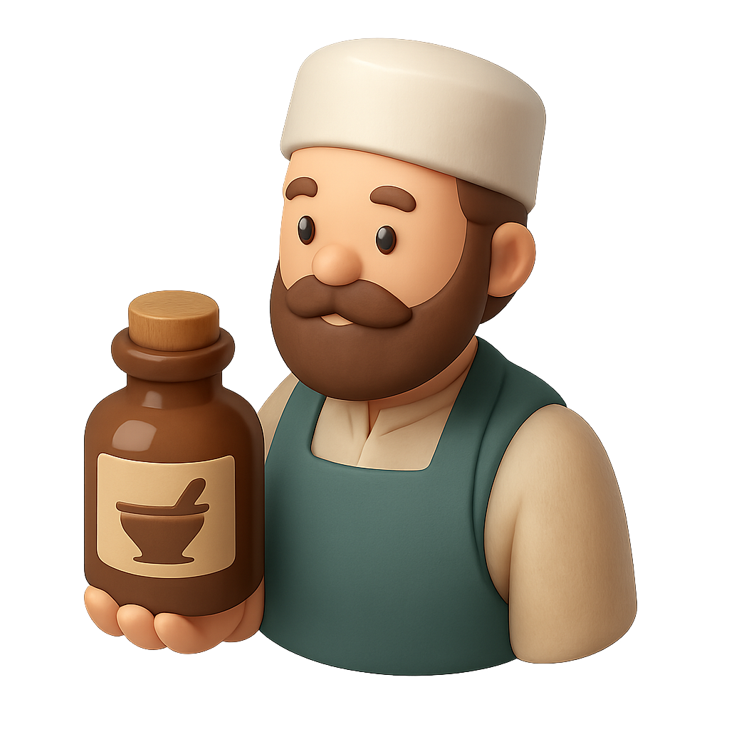 /Collection: /by davooda/Type: PNG/A stylized 3D icon of an apothecary holding a medicine bottle with a mortar symbol. The character features a beard and a traditional outfit, presented in an isometric view.