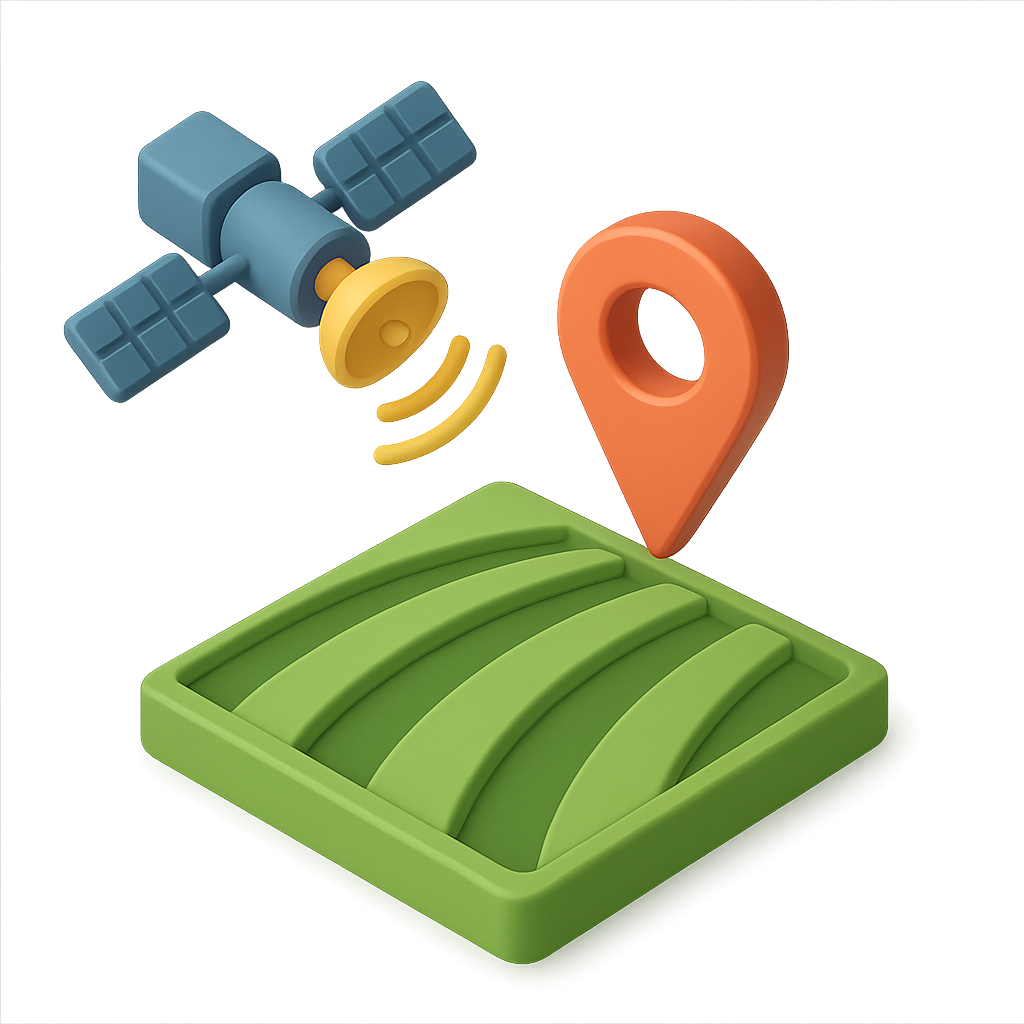 /Collection: /by davooda/Type: PNG/A stylized 3D icon representing precision agriculture, featuring a satellite, a location pin, and a textured green field, all designed with a vibrant color palette.