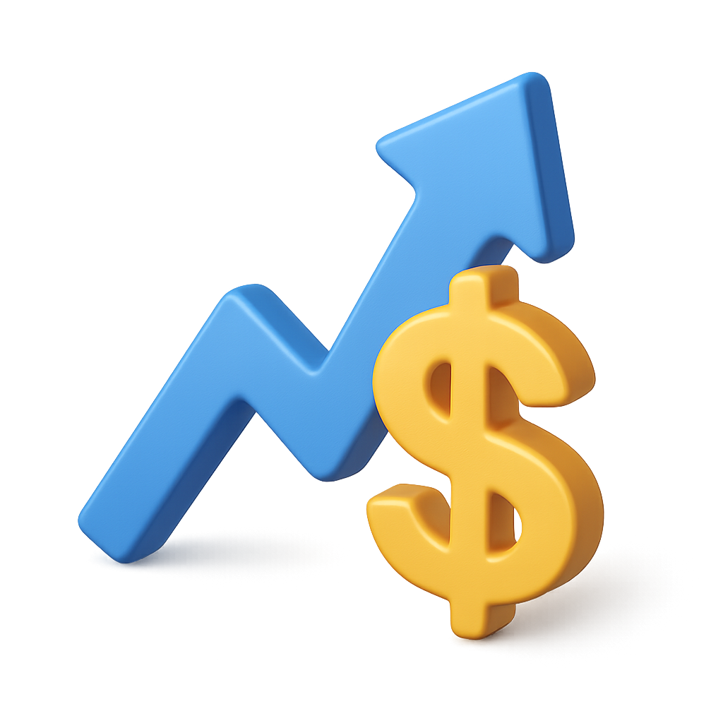 /Collection: /by davooda/Type: PNG/A 3D icon featuring a dollar sign and an upward trend arrow, designed in a vibrant color scheme. The icon has a transparent background and a volumetric appearance, emphasizing financial growth.