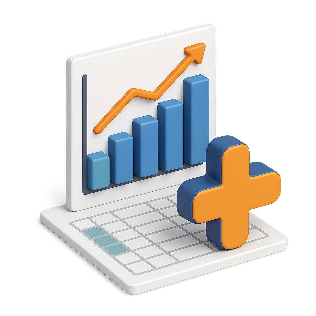 A 3D icon depicting a graph with ascending blue bars and an orange plus sign set against a transparent background, conveying a sense of growth and analytics.