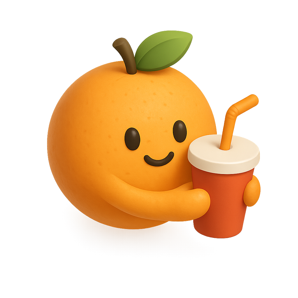 A cheerful 3D orange character holding a drink with a straw. The orange features a smile and a leaf, set against a soft gradient background.