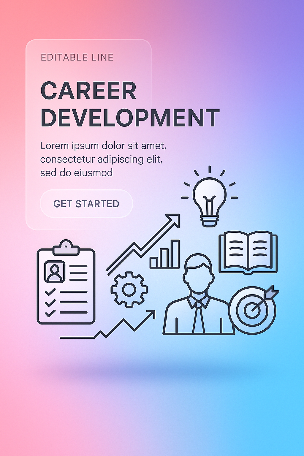 /Collection: /by davooda/Type: PNG/A vibrant infographic illustrating career development themes with icons representing skills and knowledge. Features glassmorphism panels and a bright gradient background.