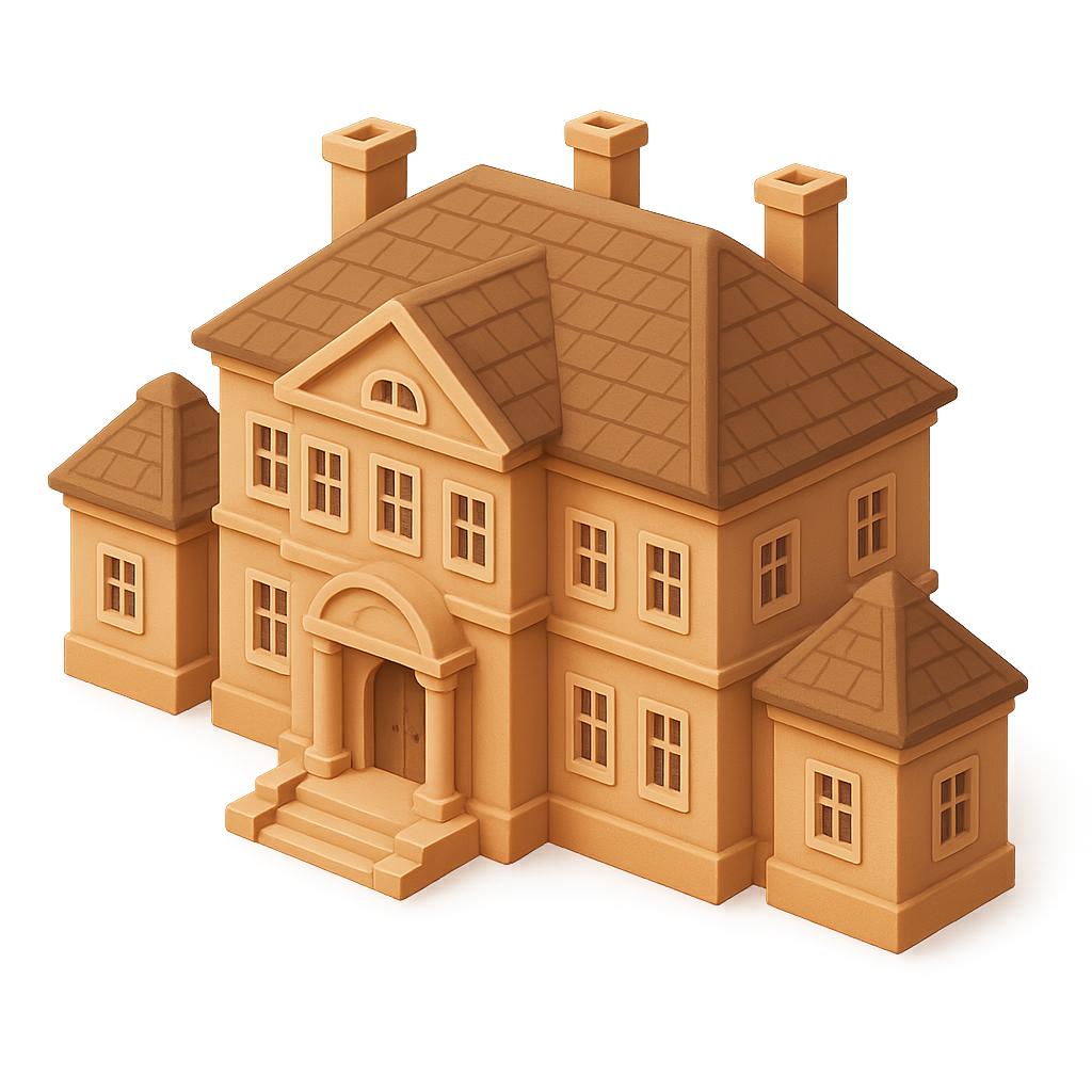 A three-quarter view of a stylized 3D manor house, featuring a volumetric design with a transparent background. The image highlights intricate architectural details.