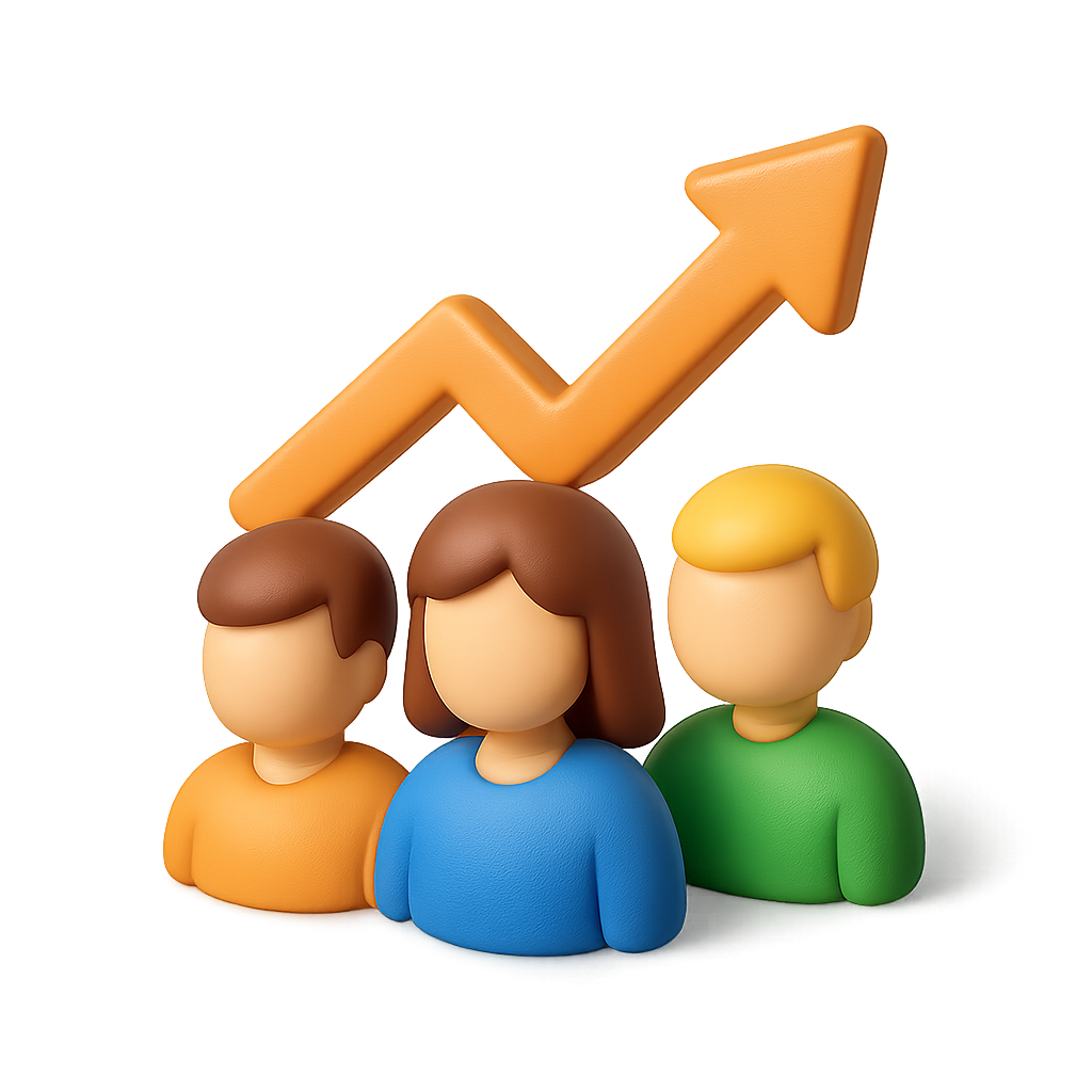 /Collection: /by davooda/Type: PNG/A colorful 3D icon depicting three stylized figures with an upward trend line behind them, symbolizing growth and collaboration. The figures are rendered in vibrant colors with a glossy finish, set against a soft gradient background.