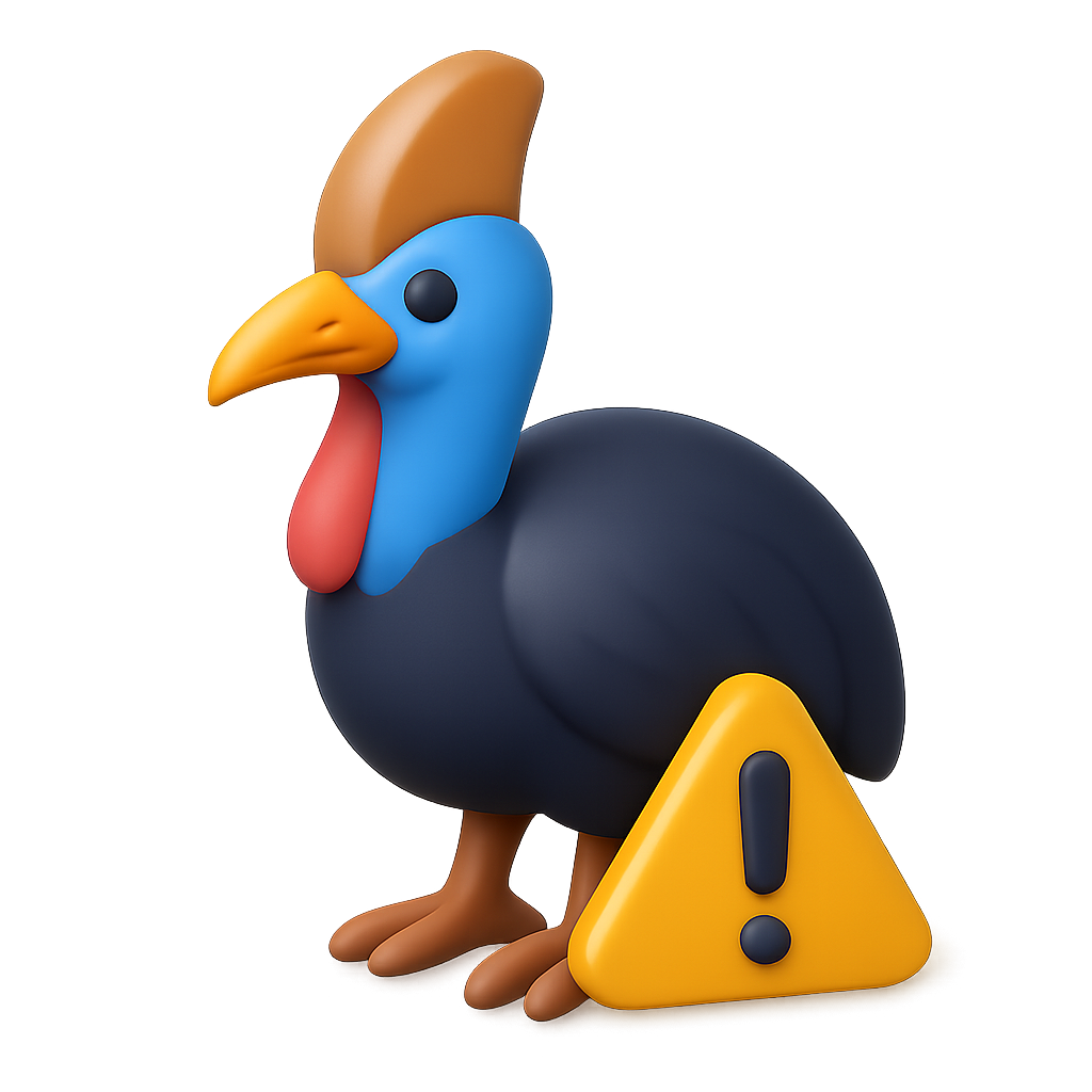 A colorful 3D icon of a cassowary in a three-quarter view, featuring a vibrant blue and orange head and a yellow warning sign, set against a blurred background.
