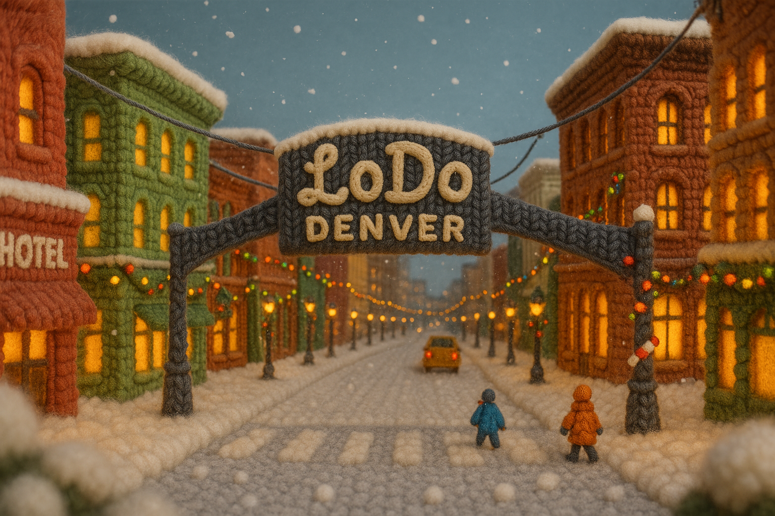 A charming 3D winter scene depicting LoDo, Denver, crafted from wool-like textures. The scene features snowflakes, warm lights, and tiny figures, creating a festive atmosphere.