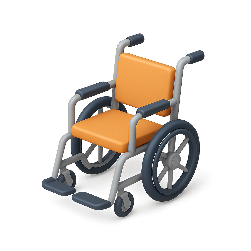 A visually striking 3D icon of a wheelchair, featuring a vibrant orange seat and detailed gray wheels. The isometric perspective adds depth, making it suitable for various applications.