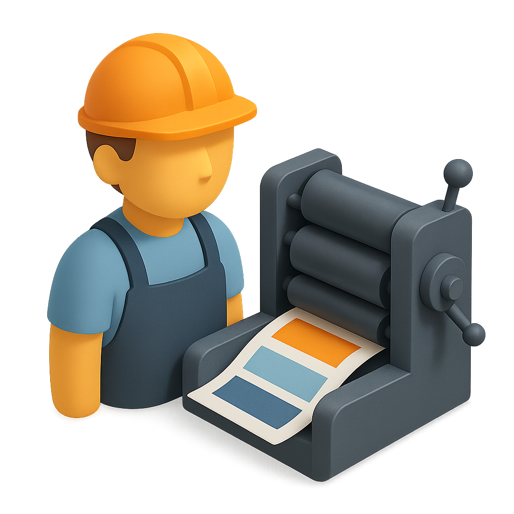 /Collection: /by davooda/Type: PNG/This 3D icon features a printer press operator wearing a hard hat next to a printing press. The design is isometric with a volumetric feel, showcasing the operator in a three-quarter view.