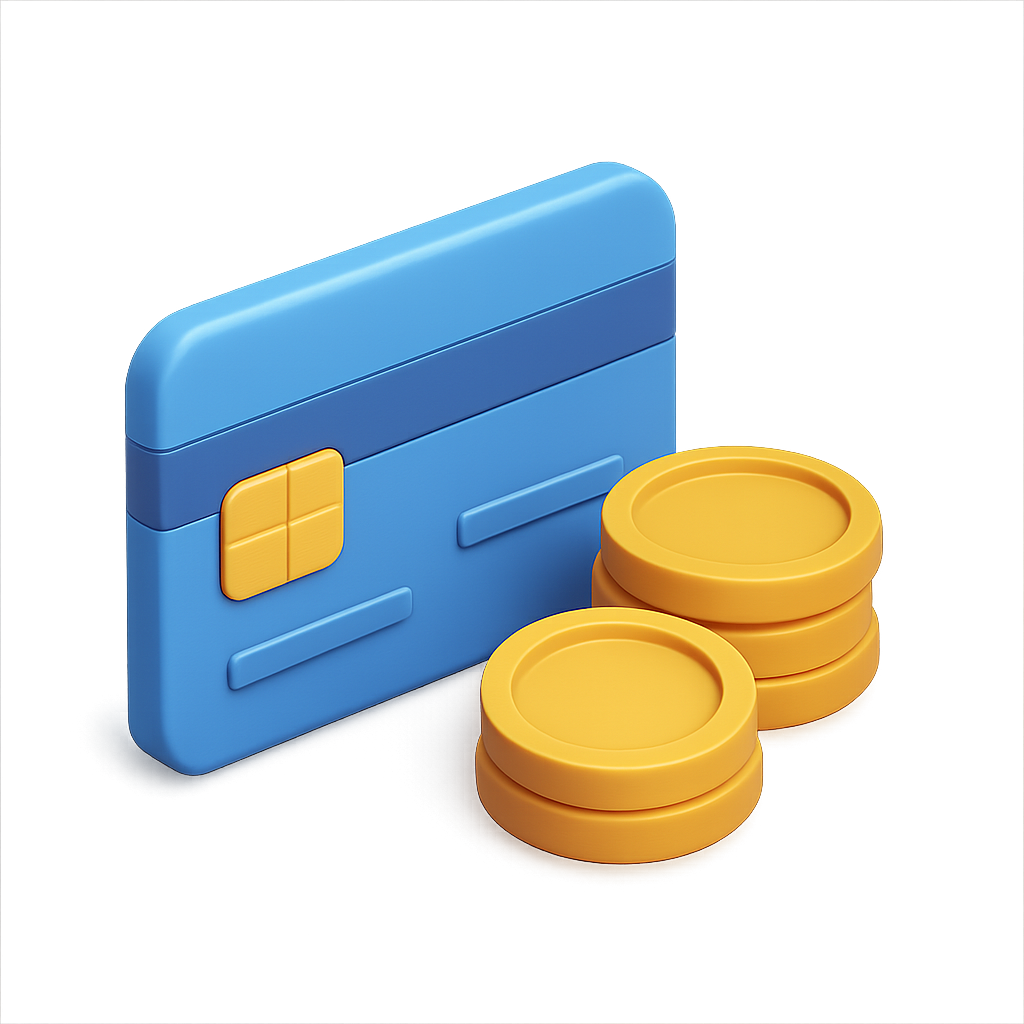 /Collection: /by davooda/Type: PNG/A visually striking 3D representation featuring a blue credit card alongside two golden coins. The design emphasizes depth and volume with an isometric view.