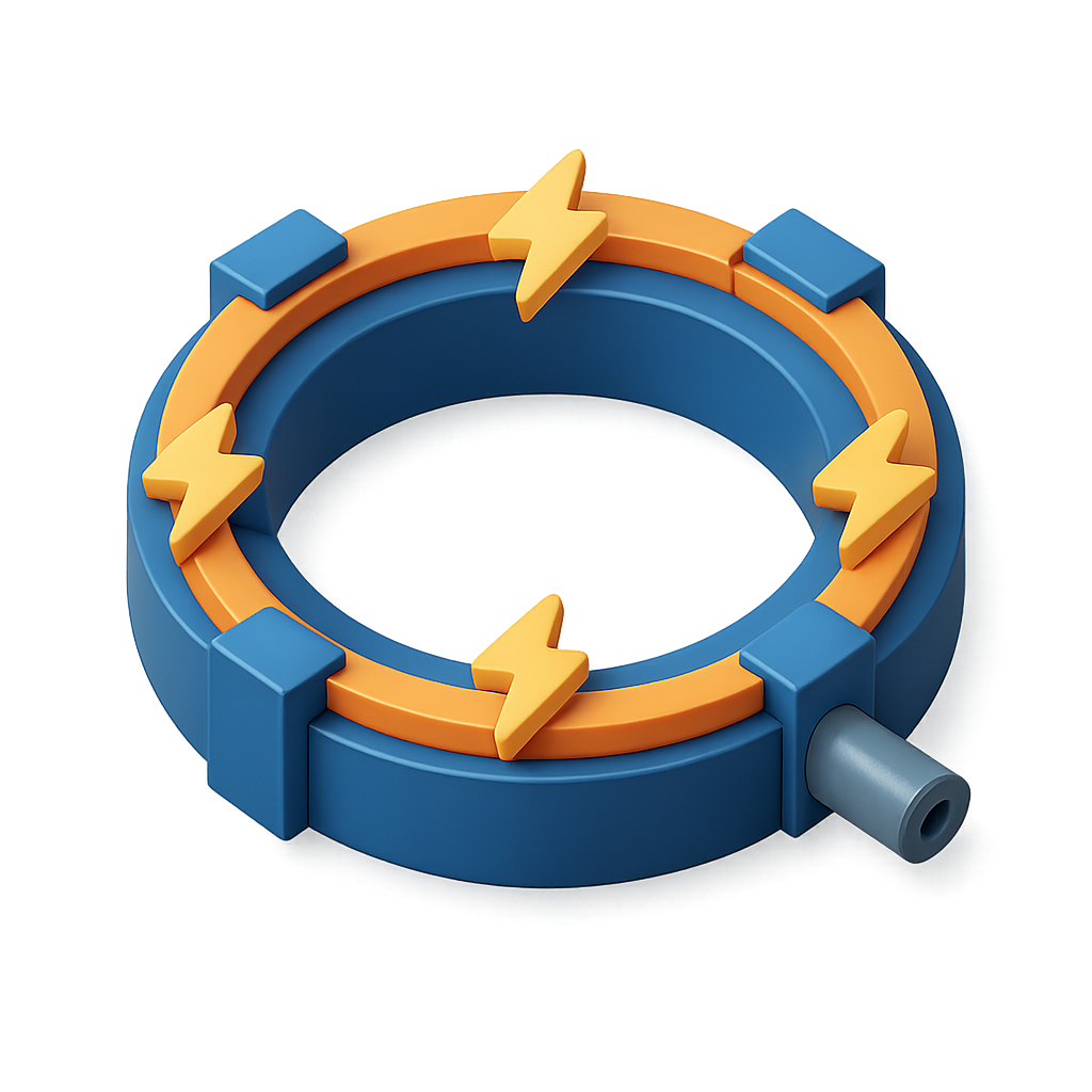 /Collection: /by davooda/Type: PNG/A stylized 3D representation of a particle accelerator ring, featuring a vibrant blue and orange color scheme with lightning bolt accents. The design emphasizes a three-quarter isometric view.