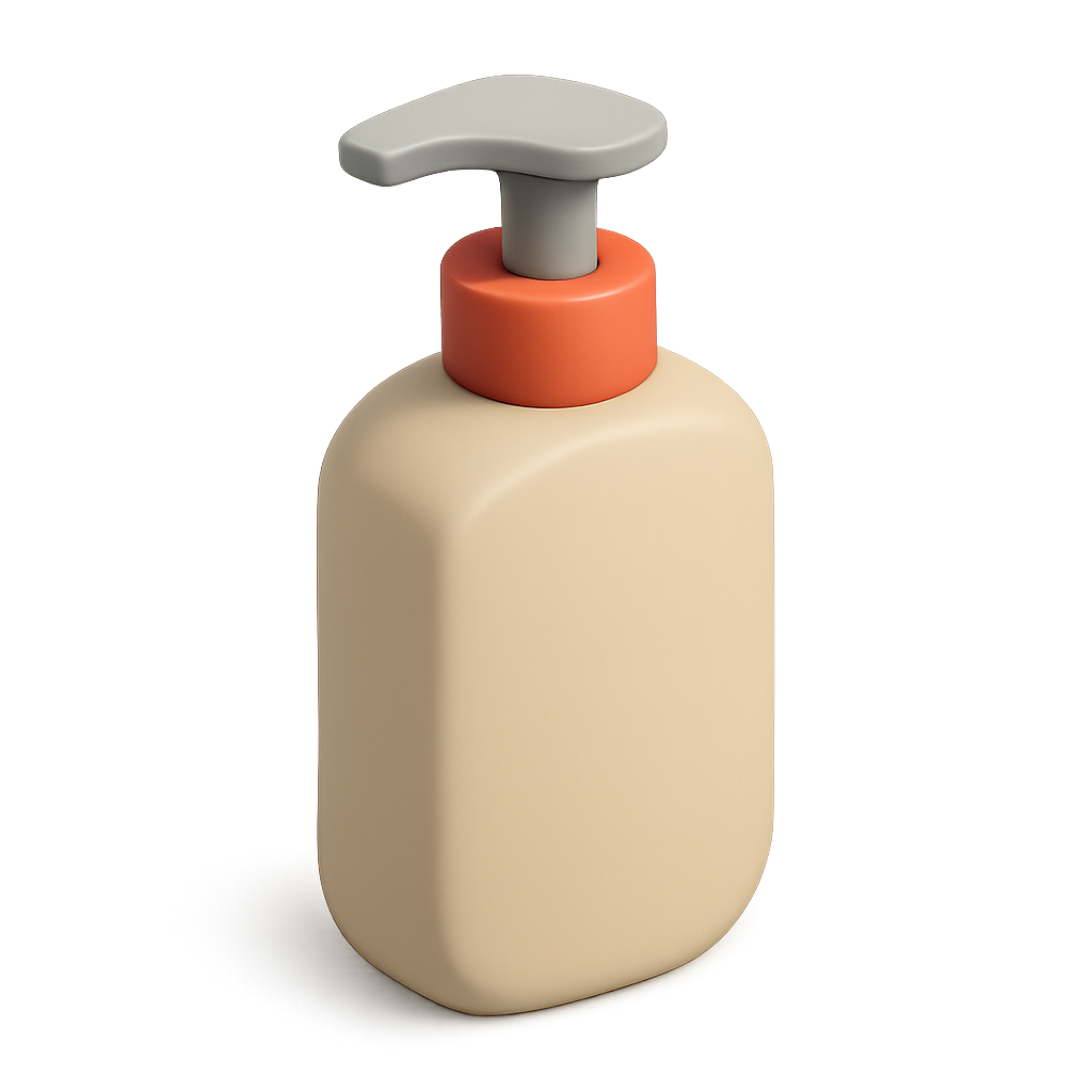 A sleek 3D lotion pump icon featuring a rounded body and a contrasting pump top. The design showcases a soft color palette, emphasizing a modern aesthetic.