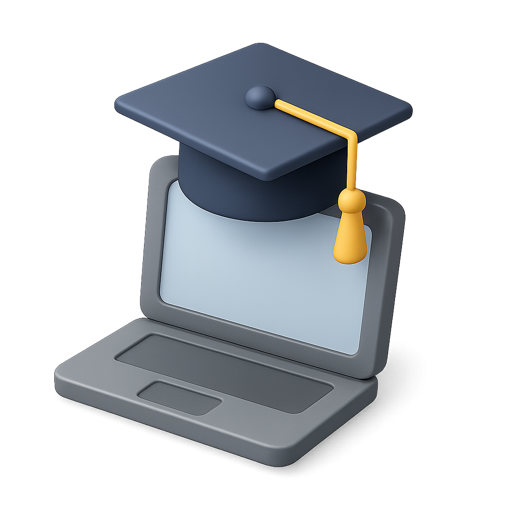 A 3D icon depicting a graduation cap placed on a laptop, featuring a transparent background and a three-quarter isometric view, emphasizing a volumetric design.