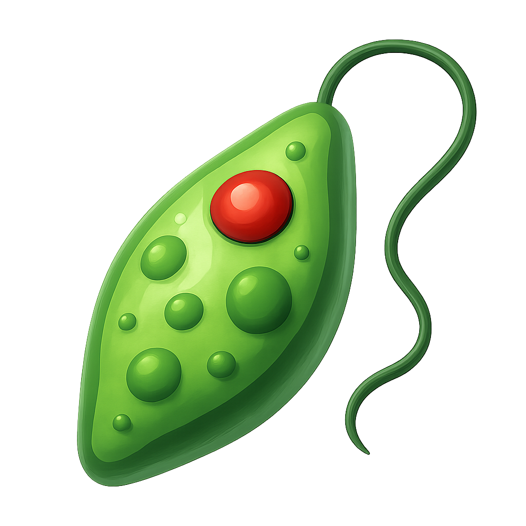 /Collection: /by davooda/Type: PNG/A stylized 3D representation of a euglena, featuring a green single cell with a glossy surface and a red dot. The icon is shown from a three-quarter view on a transparent background, emphasizing its volumetric design.