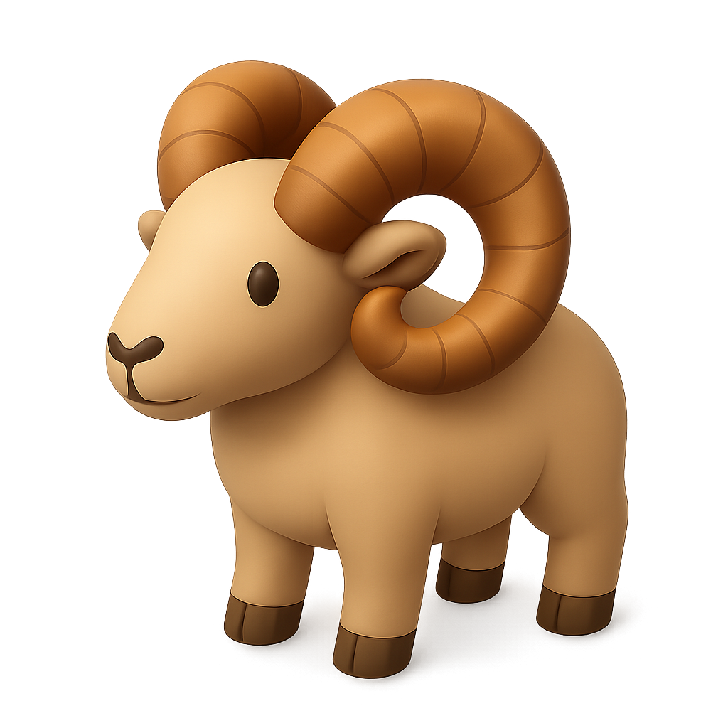 A charming 3D illustration of a ram with curved horns, presented in a three-quarter view. The design is simplistic yet volumetric, featuring a soft color palette and a transparent background.