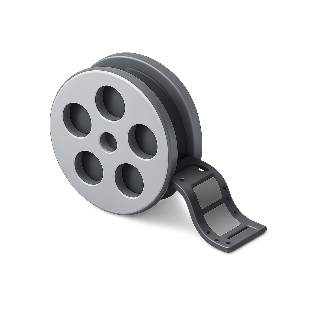 A sleek, stylized 3D icon of a film reel with a filmstrip extending from it. The design features a transparent background, showcasing a modern, isometric view.