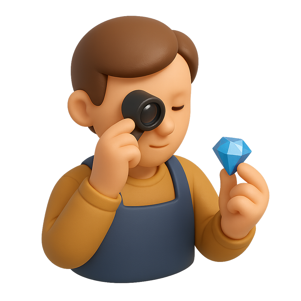 This image features a stylized 3D icon of a jeweler holding a loupe, examining a blue gemstone. The character is depicted in a three-quarter view with a soft, volumetric feel.