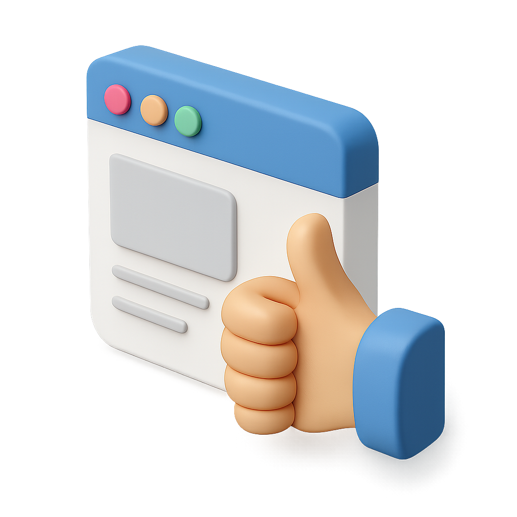 A vibrant 3D thumbs-up icon set against a transparent background, featuring a webpage design with rounded edges and colorful buttons, capturing a modern, isometric style.
