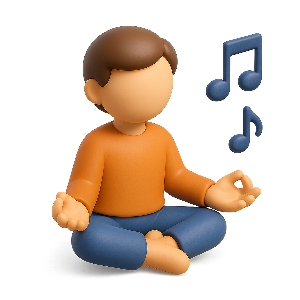 A 3D icon depicting a person meditating with music notes floating beside them. The design features a volumetric and isometric style, set against a soft gradient background.