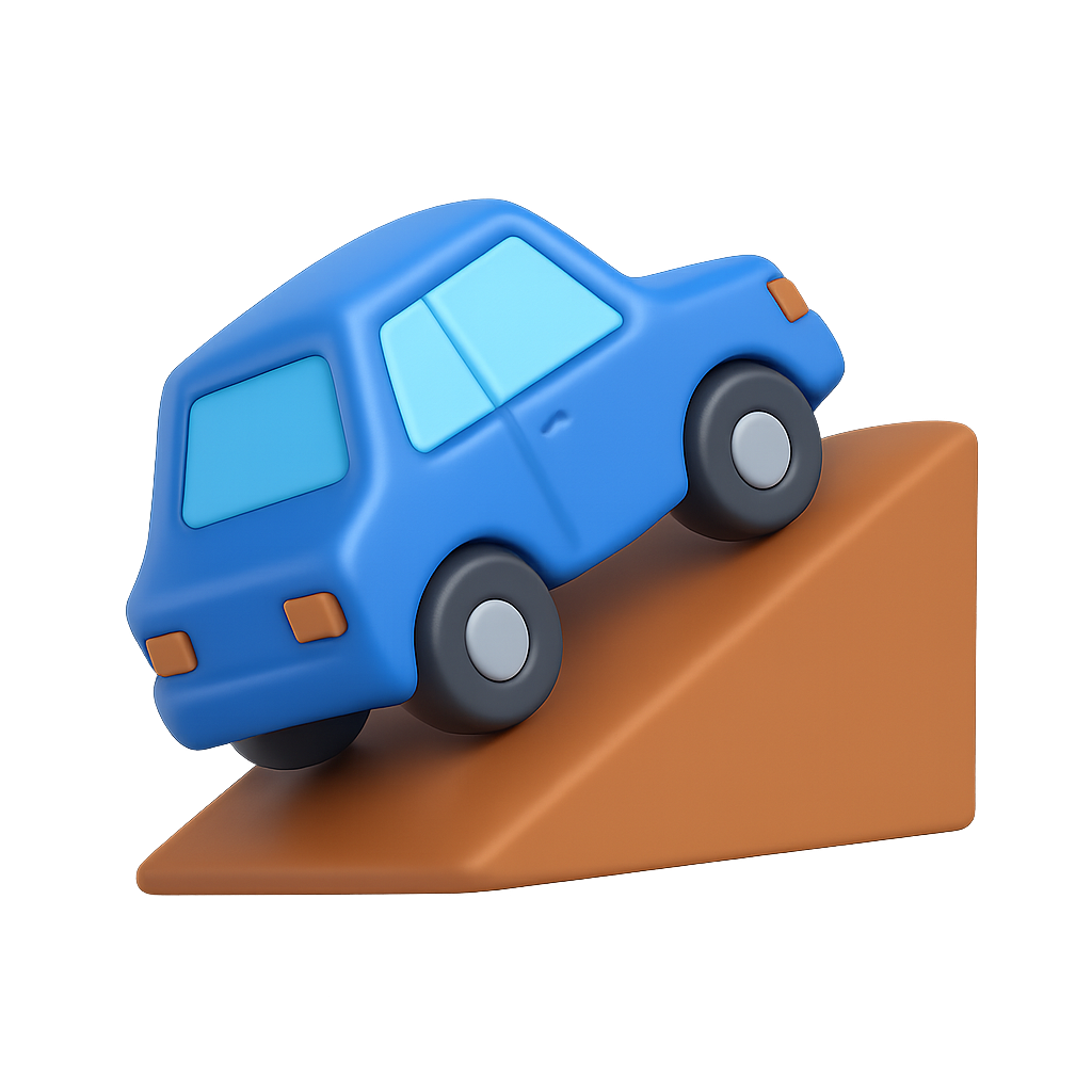A vibrant blue car depicted in a three-quarter view, ascending a brown incline. The design features a 3D feel with a smooth, glossy texture and a transparent background.