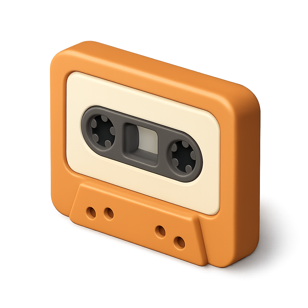 A visually striking 3D icon of a cassette tape, designed with a transparent background. The cassette features a three-quarter view, showcasing its volumetric design and vibrant colors.