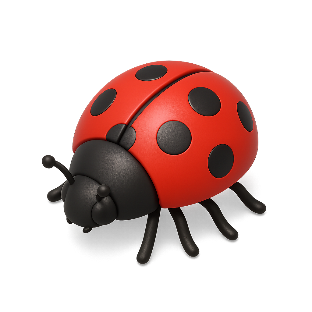 A vibrant 3D ladybug icon featuring a glossy red body adorned with black spots. The design is presented in a three-quarter view, enhancing its volumetric appearance against a soft gradient background.