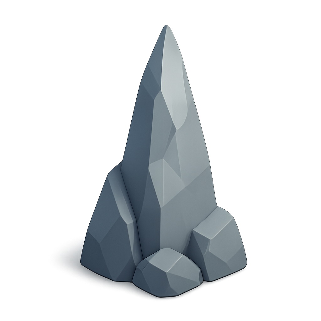 A stylized 3D representation of a pointed rock in an isometric view. The rock features a smooth surface with geometric facets, set against a subtle gradient background.