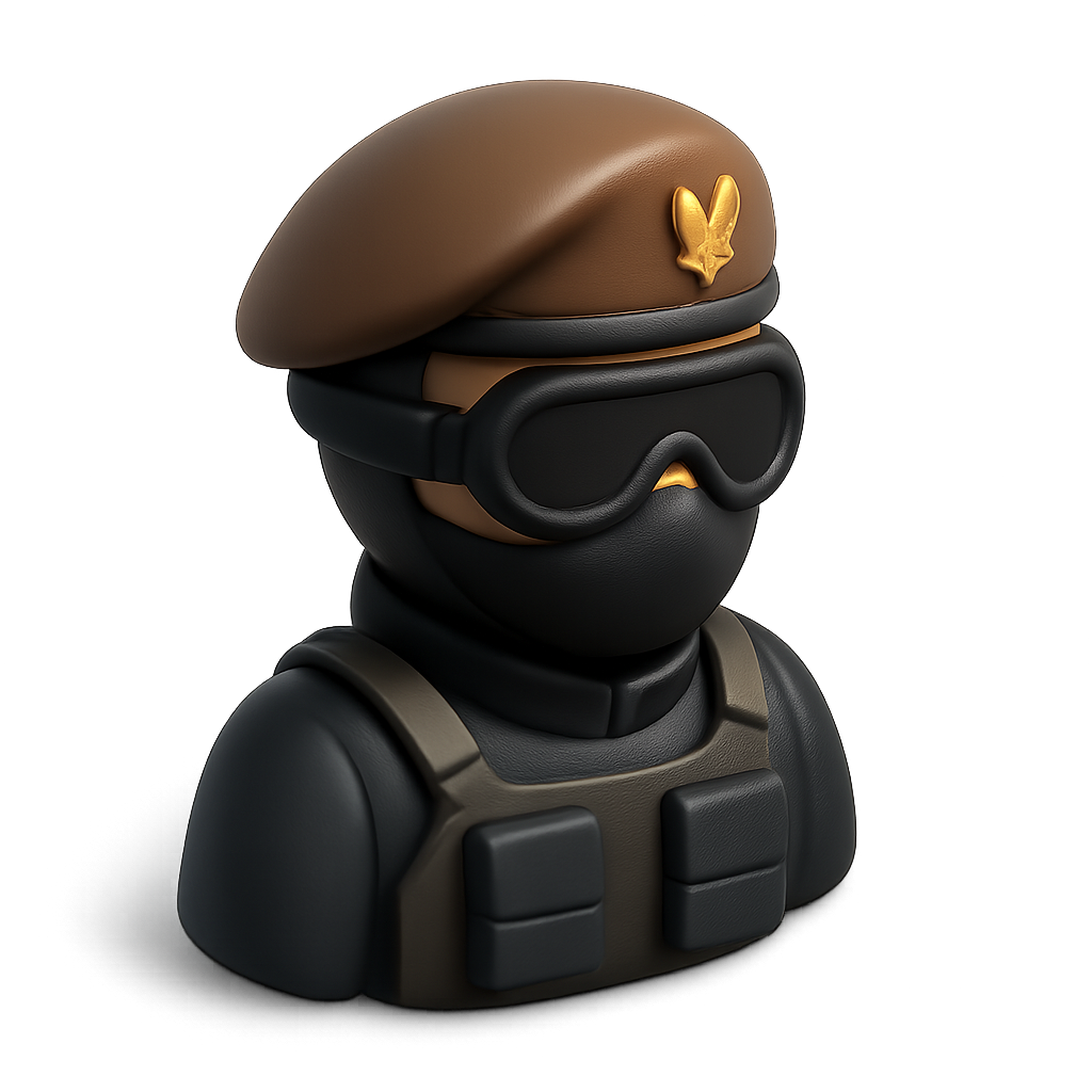 /Collection: /by davooda/Type: PNG/A stylized 3D icon representing a British SAS elite soldier, featuring a beret and goggles. The design focuses on a three-quarter view with a volumetric and isometric feel, set against a smooth gradient background.